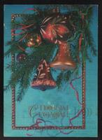 Tarjeta Postal de felicitación por el año nuevo con imagen de adornos navideños. En el anverso de la postal aparecen las palabras de felicitación en idioma ruso y en el reverso se muestra un mensaje manuscrito en idioma español de Raúl para Waty Larrogue.