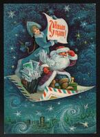 Tarjeta Postal de felicitación por el año nuevo con imagen de Santa Claus repartiendo cartas y regalos junto a una princesa rusa encima de una carta voladora. En la parte delantera de la postal se muestran las palabras de Feliz Año Nuevo en idioma ruso y al dorso se aprecia un mensaje manuscrito en idioma español de T. Mujica para Paquita.