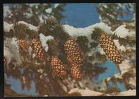 Tarjeta Postal de felicitación por el año nuevo con imagen de semillas de coníferas. En el reverso se muestra un mensaje manuscrito en idioma español de Alexandr Vaimov para Dulce.