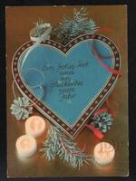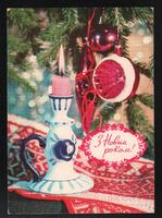 Tarjeta Postal de felicitación por el año nuevo con imagen de una vela encendida sobre un candelero y adornos navideños. En la parte delantera de la postal aparecen las palabras de Feliz Año Nuevo en idioma ruso y al dorso se observa un mensaje manuscrito en idioma español para José y Cema.