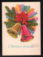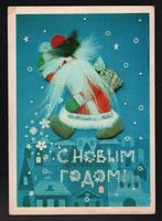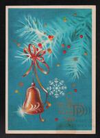 Tarjeta Postal de felicitación por el año nuevo con imagen de unas campanas y adornos navideños. En el anverso de la postal aparecen las palabras de Feliz Año Nuevo en idioma ruso y en el reverso se aprecia un mensaje de felicitación manuscrito en varios idiomas.