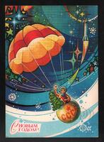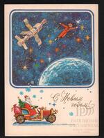 Tarjeta Postal de felicitación por el año nuevo con dibujo de Santa Claus sobre un vehículo y de un astronauta junto a un satélite en el espacio. En el anverso de la postal aparecen las palabras Feliz Año Nuevo en idioma ruso.