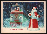 Tarjeta Postal de felicitación por el año nuevo con ilustración de Papá Noel y un niño en un metro. En el anverso de la postal aparecen las palabras Feliz Año Nuevo en idioma ruso y al dorso se aprecia un mensaje manuscrito en idioma español.