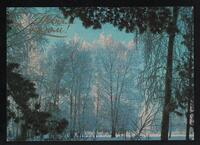 Tarjeta Postal de felicitación por el año nuevo con imagen de un bosque cubierto de nieve. En la parte delantera de la postal aparecen las palabras de felicitación en idioma ruso y al dorso se exhibe un mensaje manuscrito en español de Niurka para Omar Barneda y familia.