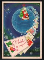 Tarjeta Postal de felicitación por el año nuevo con dibujo de Santa Claus repartiendo cartas sobre el globo terráqueo. En el anverso de la postal aparecen las palabras de Feliz Año Nuevo en idioma ruso y al dorso se oberva un mensaje manuscrito en idioma español para Juana.
