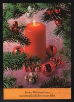 Tarjeta Postal de felicitación por el año nuevo con imagen de varias velas encendidas y adornos navideños. En el anverso de la postal aparecen las palabras de Feliz Año Nuevo en idioma de y al dorso se observa un mensaje manuscrito en español de Guillermo para Silvita.