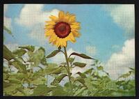 Tarjeta de felicitación por el año nuevo de la Asociación Nacional del Ciego de Cuba con imagen de un girasol. En el reverso de la tarjeta aparecen unas palabras de felicitación impresas y una firma.
