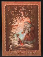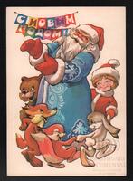 Tarjeta Postal de felicitación por el año nuevo con ilustración de Papá Noel junto a un niño y algunos animales. En la parte delantera de la postal se muestran las palabras Feliz Año Nuevo en idioma ruso y en el reverso se observa un mensaje en idioma español de T. Mujica para su madre Paquita.