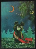 Tarjeta Postal de felicitación por el año nuevo con ilustración de Santa Claus tocando música en el bosque. En el anverso de la postal aparecen las palabras Feliz Año Nuevo en idioma ruso y en el reverso se aprecia un mensaje mecanografiado en idioma español de A.A. Skvortsov, Asesor del Micons.