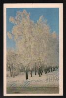 Tarjeta Postal de felicitación por el año nuevo con imagen de un bosque cubierto de nieve en un lugar desconocido. En el anverso de la postal aparecen las palabras de felicitación en idioma ruso y al dorso se muestra un mensaje manuscrito en idioma ruso.