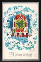 Tarjeta Postal de felicitación por el año nuevo con imagen de un reloj a punto de marcar la medianoche. En la parte delantera de la postal aparecen las palabras de felicitación en idioma ruso y en el reverso se aprecia un mensaje manuscrito en idioma español de Viki.
