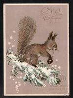 Tarjeta Postal de felicitación por el año nuevo con Ilutración de una ardilla sobre la rama de un árbol. En el anverso de la postal aparecen las palabras Feliz Año Nuevo en idioma ruso y al dorso se evidencia un mensaje manuscrito en idioma español Guary, Osmany e Idel para Ana y Yohanna.