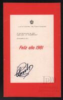 Tarjeta de felicitación por el año nuevo emitida por la Junta Central de Planificación (Cuba). En la parte delantera de la tarjeta aparece plasmada una firma.