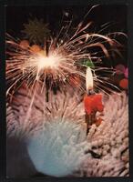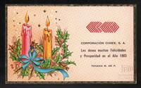 Tarjeta Postal de felicitación por el año nuevo con ilustración en relieve de velas encendidas y adornos navideños. En el anverso de la postal aparecen las palabras de felicitación de la Corporación Cimex, S.A. y el logo de la institución y en el reverso se muestra un mensaje mecanografiado en español de la presidencia de dicha corporación.