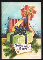 Tarjeta de felicitación por el año nuevo con ilustración de adornos navideños. En el interior de la tarjeta aparece un mensaje manuscrito en idioma español de Julio G. Escobar Solis para su amigo Juan Otero y familia.