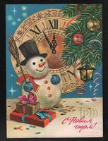 Tarjeta Postal de felicitación por el año nuevo con dibujo de un muñeco de nieve junto a unos regalos, adornos navideños y un reloj a punto de marcar la medianoche. En el anverso de la postal aparecen las palabras Feliz Año Nuevo en idioma ruso y al dorso se observa un mensaje mecanografiado en idioma español de A.A. Skvortsov, Asesor del Micons.