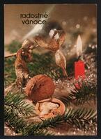 Tarjeta Postal de felicitación por el año nuevo con imagen de velas encendidas, almendras y adornos navideños. En el anverso de la postal aparecen las palabras Feliz Año Nuevo en idioma sc y al dorso se observa un mensaje manuscrito en idioma español Luis para René.