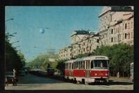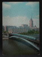 Tarjeta Postal con vista de un metro sobre un puente en Moscú, Rusia. Al dorso de la postal aparece escrito en español las palabras "Recuerdos de Moscú" y el timbre impreso en la misma postal con la imagen de Lenin.