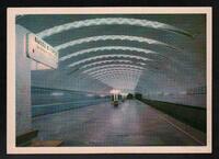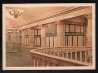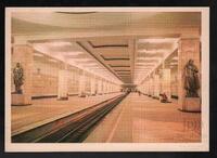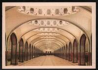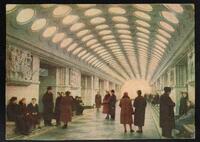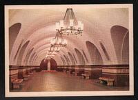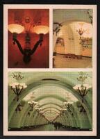 Tarjeta Postal con imagen del Vestíbulo Central de la Estación del Metro Electrozavodskaia en Moscú, Rusia. Al dorso de la postal aparece el nombre del destinatario, Terri Milyk y el emblema soviético.