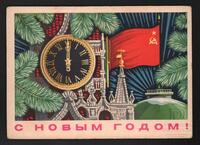 Tarjeta Postal de felicitación por el año nuevo con imagen de un reloj en lo alto de la Torre Spasskaya en el Kremlin de Moscú y la bandera de la Unión Soviética. En el anverso de la postal aparecen las palabras de felicitación Año Nuevo en idioma ruso y en el reverso se muestra un mensaje manuscrito en idioma español y ruso para Guillermo Antigua.