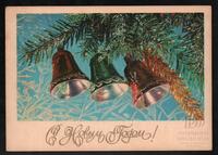Tarjeta Postal de felicitación por el año nuevo con imagen de tres campanas decorativas. En el anverso de la postal aparecen las palabras de felicitación en idioma ruso.