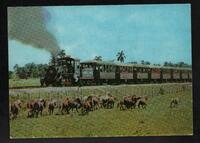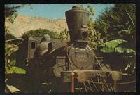 Tarjeta Postal con imagen de "La Junta", locomotora del primer ferrocarril de Cuba. En la parte trasera de la postal se muestra el slogan "Cuba alegre como su sol".