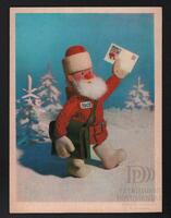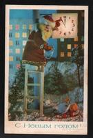 Tarjeta Postal de felicitación por el año nuevo con dibujo de Papá Noel arreglando las manecillas de un reloj. En la parte delantera de la postal aparecen las palabras Feliz Año Nuevo en idioma ruso y en el reverso se muestra un mensaje manuscrito en idioma español de Jorgito para sus primas Mirita y Wydma.