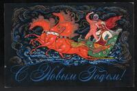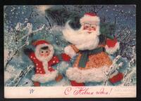 Tarjeta Postal de felicitación por el año nuevo con imagen de Santa Claus y un niño con el traje típico navideño. En el anverso de la postal aparecen las palabras de felicitación en idioma ruso y en el reverso se muestra un mensaje.