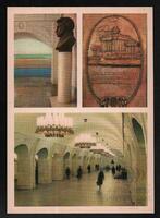 Tarjeta Postal con tres imágenes de la Estación Pushkinskaya en Moscú, Rusia. Se exhiben las imágenes de una estatua, una tarja conmemorativa y el lobby donde se encuentra dicha estatua.