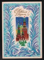 Tarjeta Postal de felicitación por el año nuevo y el 19 aniversario del Triunfo de la Revolución Cubana con imagen de algunas edificaciones del Kremlin de Moscú. En el anverso de la postal aparecen las palabras Feliz Año Nuevo en idioma ruso y al dorso se muestra un mensaje manuscrito en idioma español para Daly, Juanita y Remi de Tema.