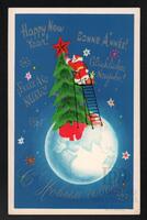 Tarjeta Postal de felicitación por el año nuevo con imagen de Papá Noel, un árbol de navidad y el globo terráqueo. En el anverso de la postal aparecen las palabras Feliz Año Nuevo en diversos idiomas y al dorso se muestra un mensaje manuscrito en idioma ruso.