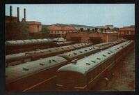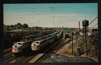 Tarjeta Postal con imagen de The Canadian Pacific Railway Station y the Transcontinental Train "The Canadian" en la estación de Sudbury en Ontario, Canadá. Publicado por Sudbury News Service Ltd. En la parte trasera de la postal se muestran un mensaje en inglés, una estampa de color rojo con la imagen de la reina Isabel II y dos cuños.
