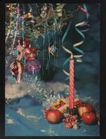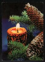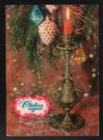 Tarjeta Postal de felicitación por el año nuevo con imagen de una vela encendida y adornos navideños. En el anverso de la postal aparecen las palabras Feliz Año Nuevo en idioma ruso y letras plateadas y en el reverso se observa un mensaje manuscrito en idioma ruso también.