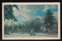 Tarjeta Postal de felicitación por el año nuevo con imagen de un bosque cubierto de nieve. En el anverso de la postal aparecen las palabras de felicitación en idioma ruso y en el reverso se muestra un mensaje en español.
