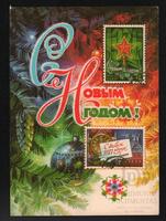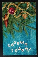 Tarjeta Postal de felicitación por el año nuevo con imagen de guirnaldas y adornos navideños. En el anverso de la postal aparecen las palabras de felicitación en idioma ruso y en el reverso se muestra un mensaje en idioma ruso también.