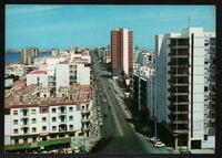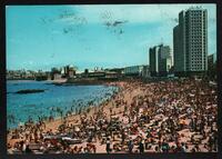 Tarjeta Postal con vista parcial de la Playa de Riazor y sus bañistas en La Coruña, Galicia (España). En la parte trasera de la postal aparece un mensaje en español de J. Pent para Teresita de Pepe, una estampilla de color rosado con imagen de Francisco Franco y valor de 20 pecetas, el logo de la editorial y un cuño prácticamente borroso.