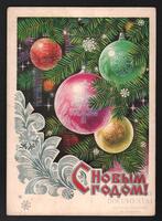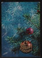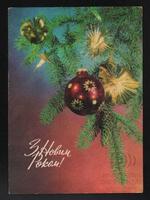 Tarjeta Postal de felicitación por el año nuevo con imagen de adornos navideños. En el anverso de la postal aparecen las palabras de felicitación en idioma ruso y en el reverso se muestra un mensaje en idioma español.