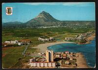 Tarjeta Postal con vista general aérea del pueblo de Javea en Alicante, Valencia (España) y al fondo el Parque natural del Masizo del Montgó. Fotografía de Hermanos Galiana-Callosa de Ensarria. En el anverso de la postal aparece el escudo de la ciudad y en la parte trasera se muestra un mensaje en español de Rafa, un timbre de color rosado con la imagen de Francisco Franco y valor de dos pecetas y un cuño fechado el 28 de mayo de 1975.