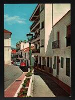 Tarjeta Postal con perspectiva parcial de la Calle del Castillo en Estepona, Andalucía (España). Al dorso de la postal se presenta un mensaje en español de Mayte para Rosa Castañeda, una estampa de color morado con la imagen de Francisco Franco por un valor de dos pecetas y un cuño fechado en agosto de 1972.