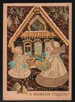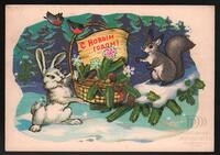 Tarjeta Postal de felicitación por el año nuevo con dibujo de una ardilla, un conejo y unas aves alrededor de una cesta de regalos. En el anverso de la postal aparecen las palabras Feliz Año Nuevo en idioma ruso y en al dorso se distingue un mensaje manuscrito en idioma español de Rupy para su hermana Miriam y el sello postal.