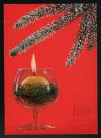 Tarjeta Postal de felicitación por el año nuevo con imagen de una vela encendida dentro de una copa. En el reverso se muestra un mensaje en idioma español.
