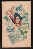 Tarjeta Postal de felicitación por el año nuevo con imagen de Papá Noel rodeado de cartas de felicitación en varios idiomas. En el anverso de la postal aparecen las palabras Feliz Año Nuevo en diversos idiomas y en el reverso se muestra un mensaje manuscrito en idioma español de Mery para América, Chuchi, Alberto y sus sobrinos.