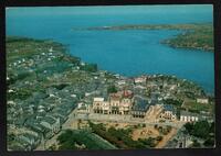 Tarjeta Postal con vista aérea de la ciudad de Ribadeo en Galicia, España. En el reverso de la postal aparece un mensaje en español para Conchita Prieto Gómez, un sello postal de color verde con la imagen de Francisco Franco y valor de 1,50 pecetas y un cuño fechado el 23 de abril de 1969.