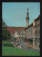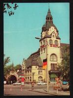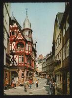 Tarjeta Postal con vista de la zona peatonal del centro histórico de la ciudad de Marburg an der Lahn en Alemania. En el reverso de la postal aparecen unas palabras de felicitación en español de Gabriel para Clarita.