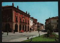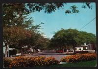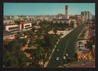 Tarjeta Postal con imagen de la Avenida José Horacio Rodríguez en La Vega. En el reverso de la postal aparece un mensaje en español de Tere para Rita Rentas, dos sellos postales y un cuño.