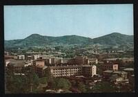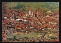 Tarjeta Postal con vista panorámica de la ciudad de Medellín en Colombia. Banco de fotografías Movifoto. En el reverso de la postal aparece un mensaje en español de Vilma para José Luis Balbin, un cuño y un sello postal.