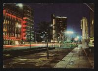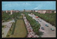 Tarjeta Postal con vista nocturna de la avenida Karl Marx en Berlín, Alemania. En el reverso de la postal aparece una dedicatoria en alemán para María Otero.