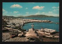 Tarjeta Postal con una vista parcial de la isla Mikonos en Grecia. En el reverso de la postal aparece un mensaje en español para José maría Codina y un sello casi rasgado.