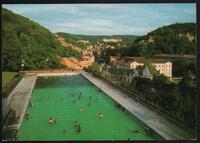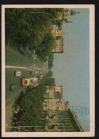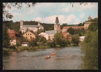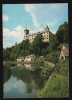 Tarjeta Postal con vista del castillo estatal, lago y pueblo de Rozmberk en la República Checa. En el centro superior del reverso de la postal aparece un logo con la imagen de un castillo.