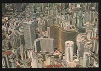 Tarjeta Postal con vista aérea de la ciudad de Sao Paulo en Brasil. En el reverso de la postal aparecen anotados unos números, un sello postal de color dorado, un cuño borroso y una breve descripción general de la ciudad.